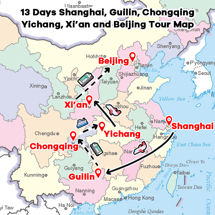 Price does not include airport/train station pick up or drop off in Beijing, Xian and Shanghai, it is easy to arrange a taxi by yourself with minimum cost. All excluded pick up and drop off service are marketed in Detailed itinerary.