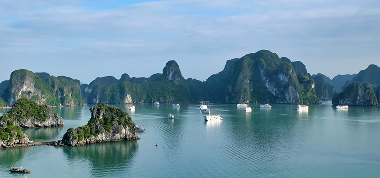 Stay overnight on a cruise in Halong Bay, a UNESCO World Heritage Site near Hanoi, to fully enjoy the stunning natural beauty of the limestone islands, explore the caves, or simply go diving and swimming in the shimmering sea.