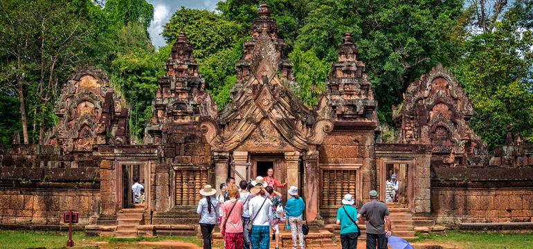 Banteay Srei. This temple, built in 976 AD and carved out of red sandstone, is one of the three sacred temples in Cambodia and is dedicated to the Hindu god Shiva.