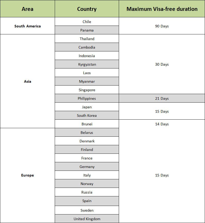 Holders of the APEC Business Travel Card, which is issued by the country of origin within the Asia-Pacific Economic Cooperation area, may enter the country visa-free for business trips for up to 60 days.