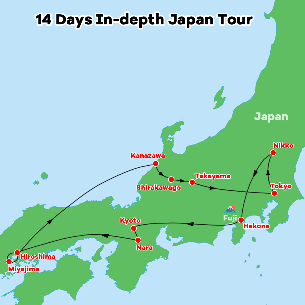 The round trip from Tokyo will take you to visit the highlights of Japan, including Tokyo, Kyoto, Hiroshima, etc. in one go.